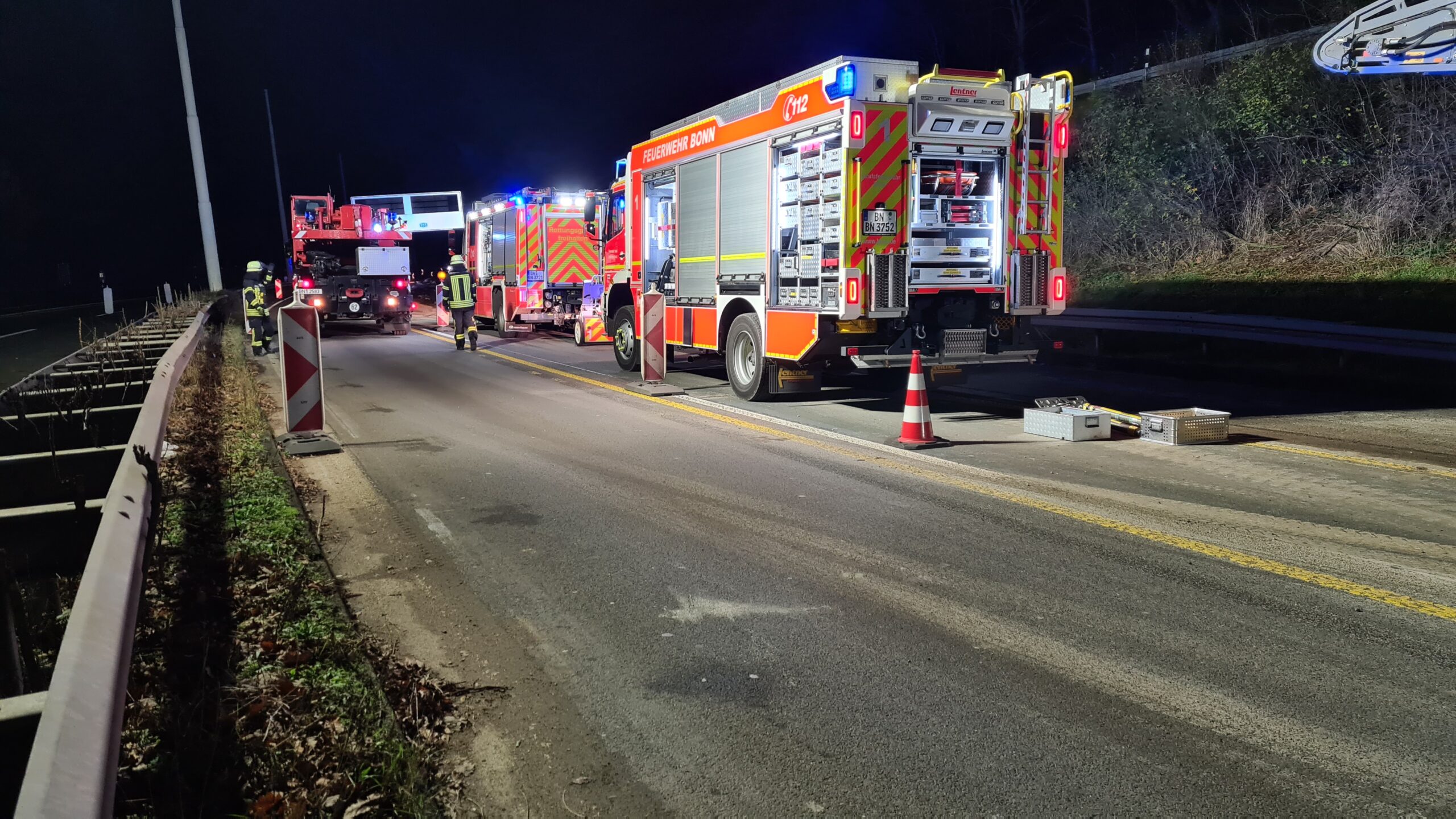 Auf der Autobahn 565, zwischen den Anschlussstellen Poppelsdorf und Endenich, sorgten Bauarbeiten in der Nacht für einen spektakulären Einsatz von Feuerwehr und Rettungskräften. Die Fahrbahndecke in Fahrtrichtung Köln wurde großflächig abgetragen, als plötzlich ein unterirdischer Versorgungsschacht einbrach, der Wasserleitungen unter der Autobahn beherbergte. Eine Asphaltfräse drohte mit ihren hinteren Kettenantrieben in den Schacht zu stürzen.