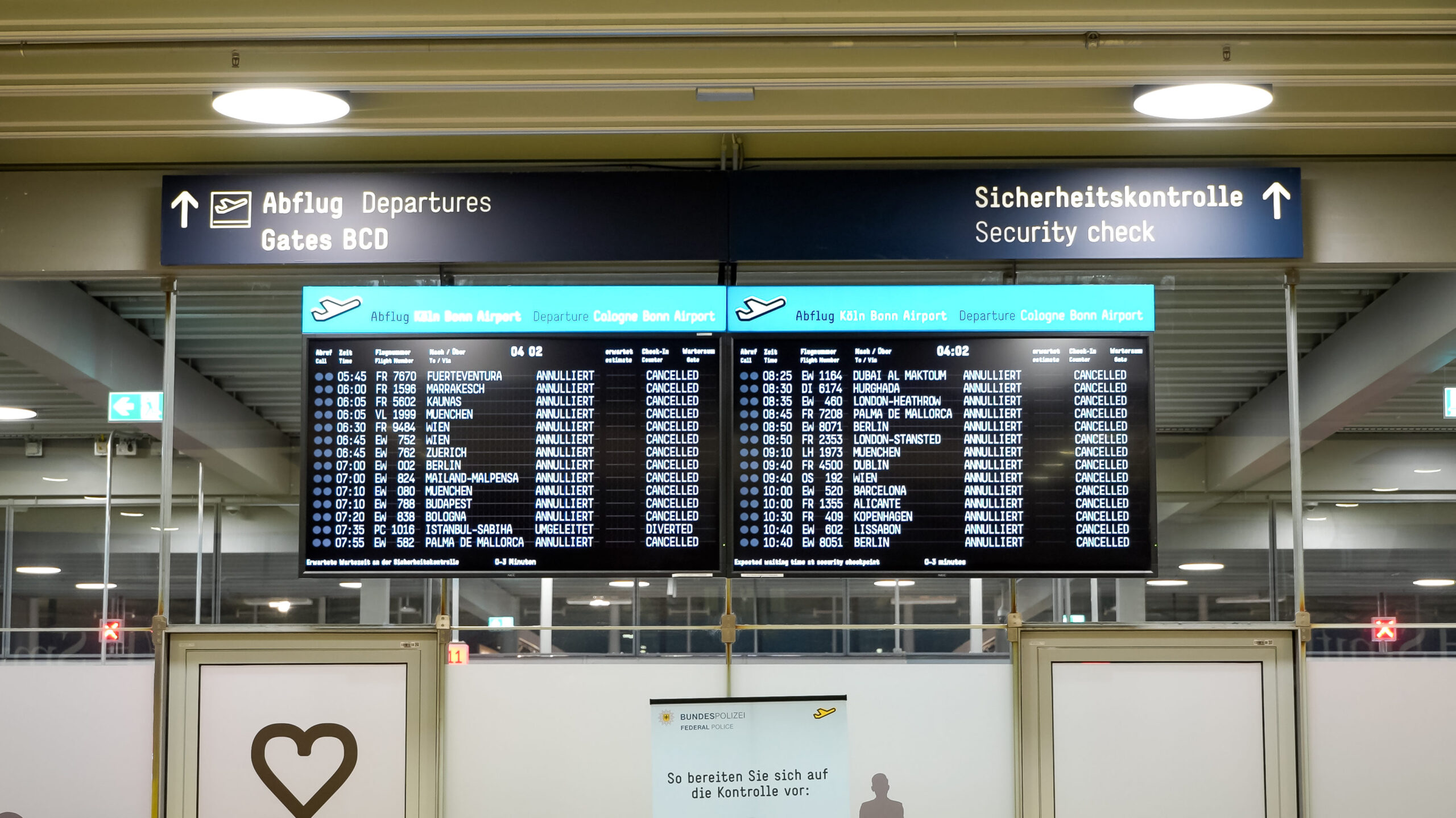 Der Flughafen Köln/Bonn wird am Montag nahezu stillstehen. Ein massiver Warnstreik der Gewerkschaft ver.di legt das Luftdrehkreuz über Stunden weitgehend lahm. Bereits am Sonntag hatten die Fluggesellschaften mit ersten Streichungen auf die angekündigten Arbeitsniederlegungen reagiert. Inzwischen steht fest: Von den ursprünglich geplanten 172 Passagierflügen werden 98 Flüge – je 49 Starts und Landungen – nicht stattfinden. Der Protest trifft damit nicht nur den innerdeutschen Flugverkehr, sondern auch internationale Verbindungen. Betroffen sind sowohl große Airlines als auch Billigfluggesellschaften. Der Streik, der um vier Uhr morgens beginnt, wird sich über den gesamten Montag bis in den frühen Dienstagmorgen hineinziehen.