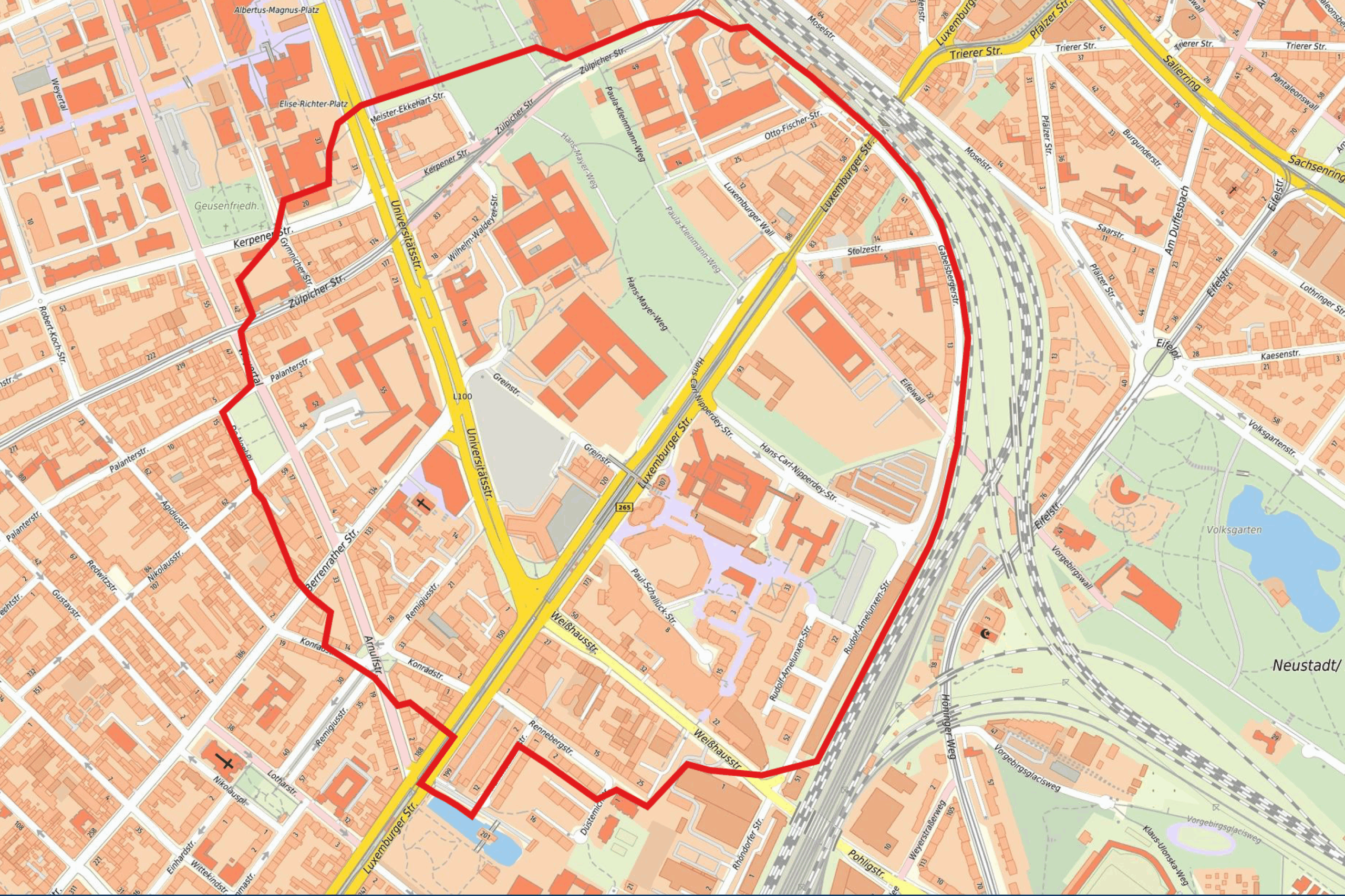 Ein weit verzweigtes Netz von Straßensperrungen wurde eingerichtet. Unter anderem sind die Universitätsstraße ab Meister-Ekkehart-Straße, der Bruno-Kisch-Weg, der Zülpicher Wall und zahlreiche Nebenstraßen nicht mehr zugänglich. Auch wichtige Verkehrsachsen wie die Luxemburger Straße und die Berrenrather Straße sind betroffen – teilweise mit konkreten Hausnummern als Sperrgrenze. Der Südbahnhof bleibt geschlossen, zumindest am Ausgang Otto-Fischer-Straße.