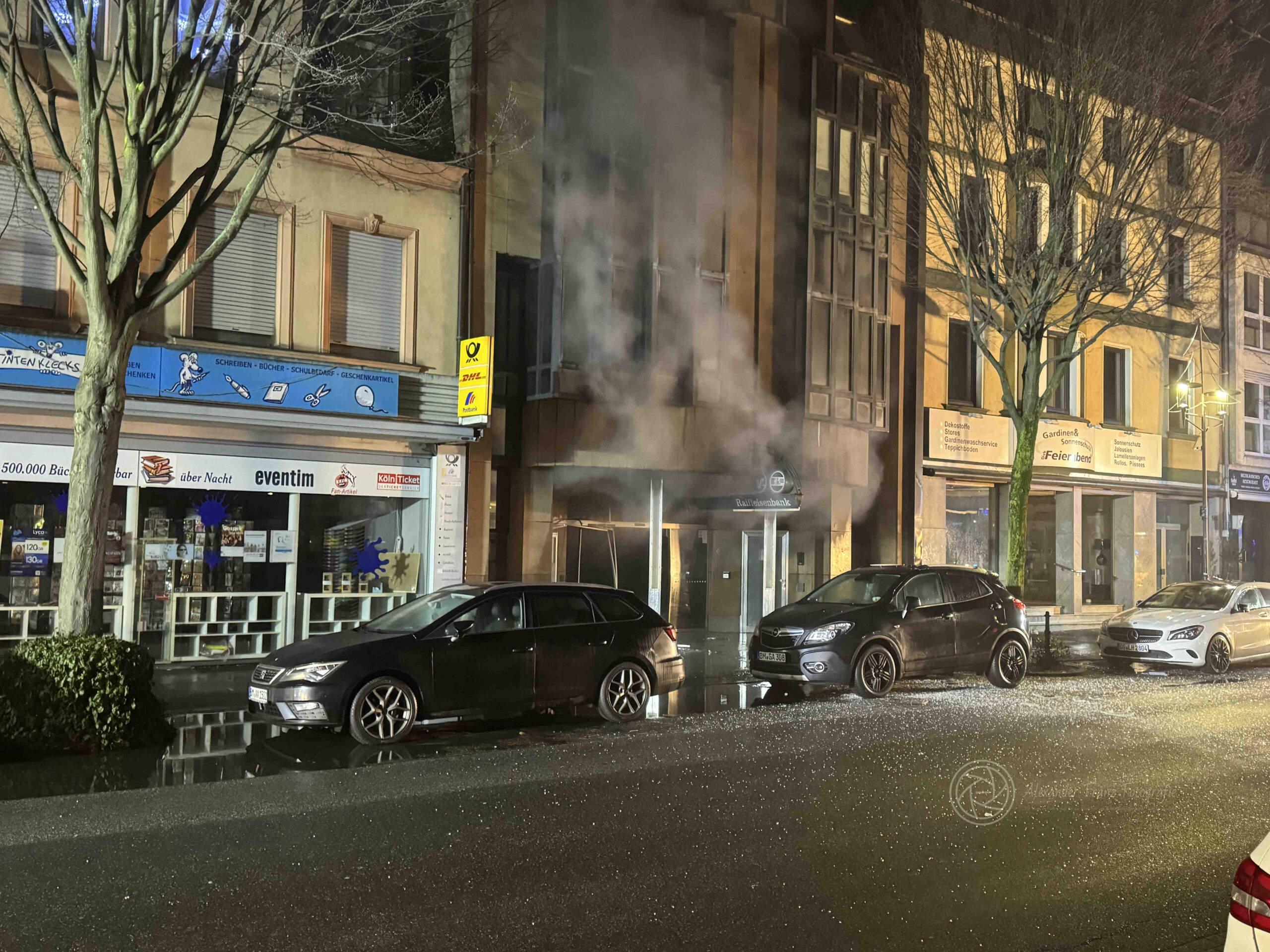 In der Nacht zu Freitag erschütterte eine mutmaßliche Geldautomatensprengung die Hauptstraße in Horrem. Gegen 2:27 Uhr ging bei der Feuerwehr Kerpen eine Alarmmeldung über eine Explosion in der Volksbank auf der Hauptstraße 171 ein. Bereits auf der Anfahrt bemerkten die Einsatzkräfte eine starke Rauchentwicklung, beim Eintreffen stand das Gebäude in Flammen.