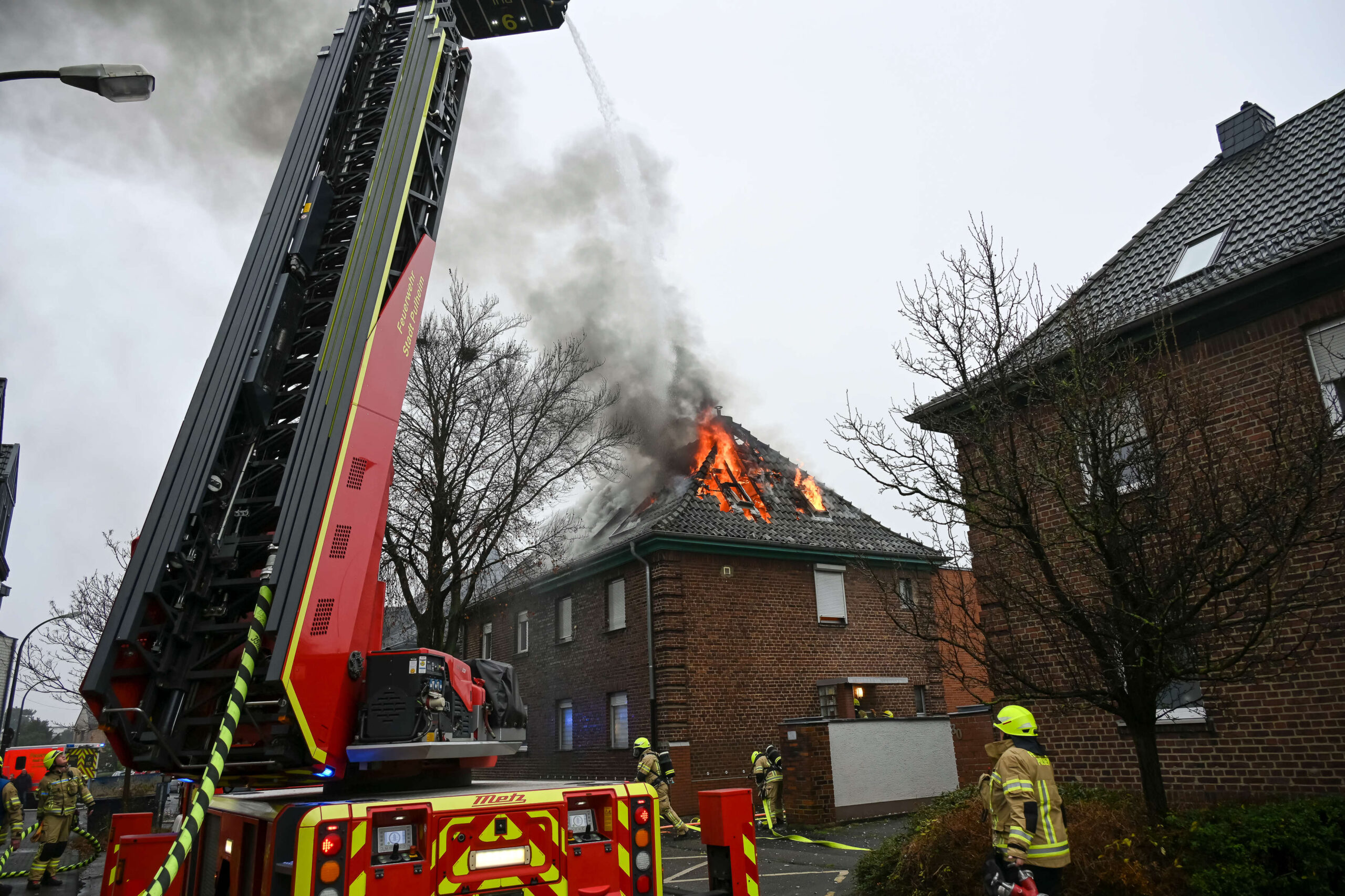 Am ersten Weihnachtsfeiertag kam es in Pulheim zu einem folgenschweren Dachstuhlbrand, der ein dreistöckiges Doppelhaus nahezu vollständig zerstörte. Gegen 10:25 Uhr wurde die Feuerwehr alarmiert und rückte mit einem Großaufgebot aus, darunter die hauptamtliche Wache sowie die Löschzüge Pulheim und Stommeln. Schon aus der Ferne war der dichte Rauch sichtbar, und bei Ankunft schlugen Flammen meterhoch aus dem Dachstuhl.