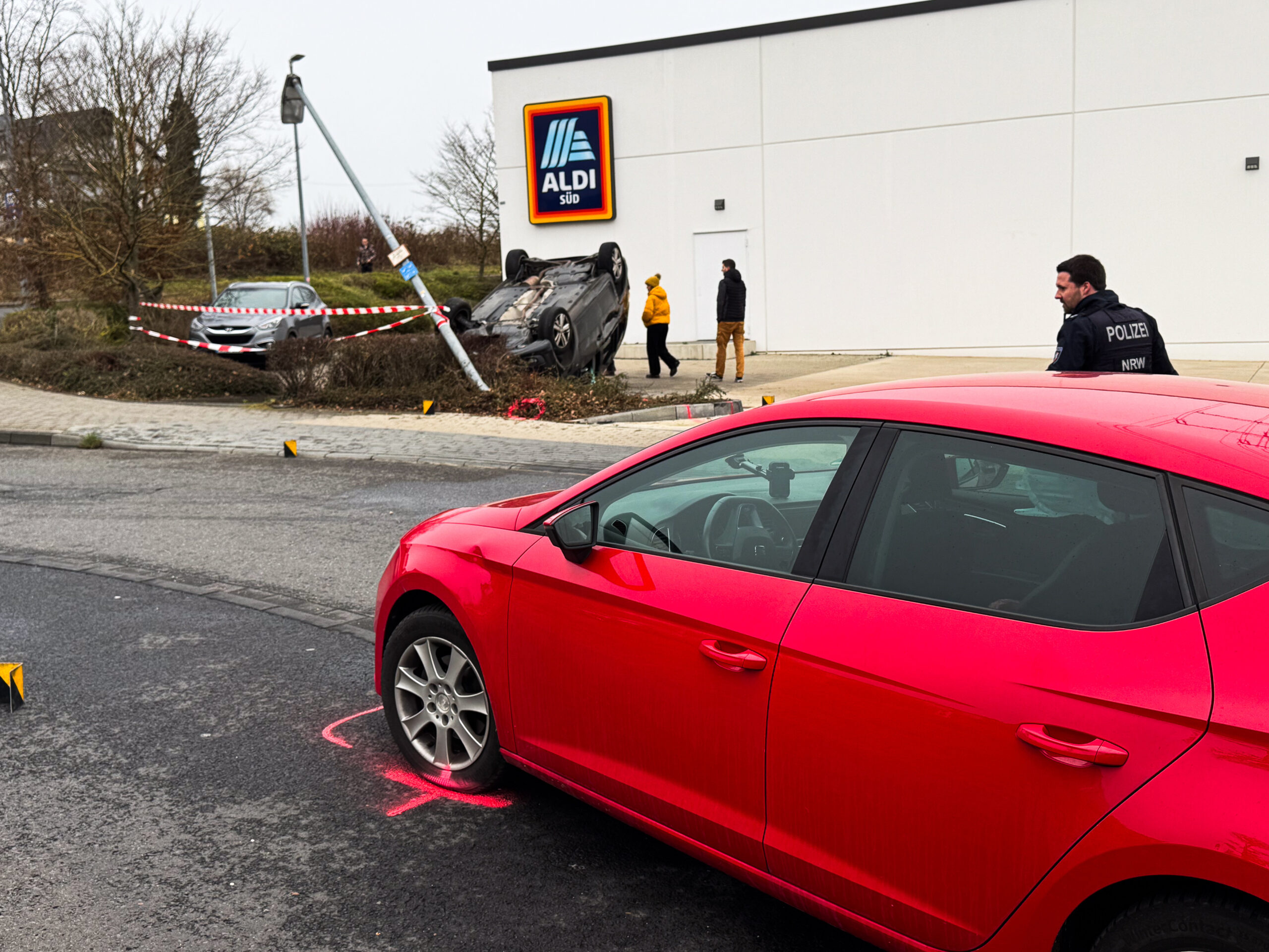Beide Fahrzeuge kollidierten. Durch den Aufprall verlor die Seniorin die Kontrolle über ihren Wagen, prallte gegen einen Laternenmast und überschlug sich. Ihr Fahrzeug kam erst auf dem Parkplatz einer nahegelegenen Aldi-Süd-Filiale zum Stehen.