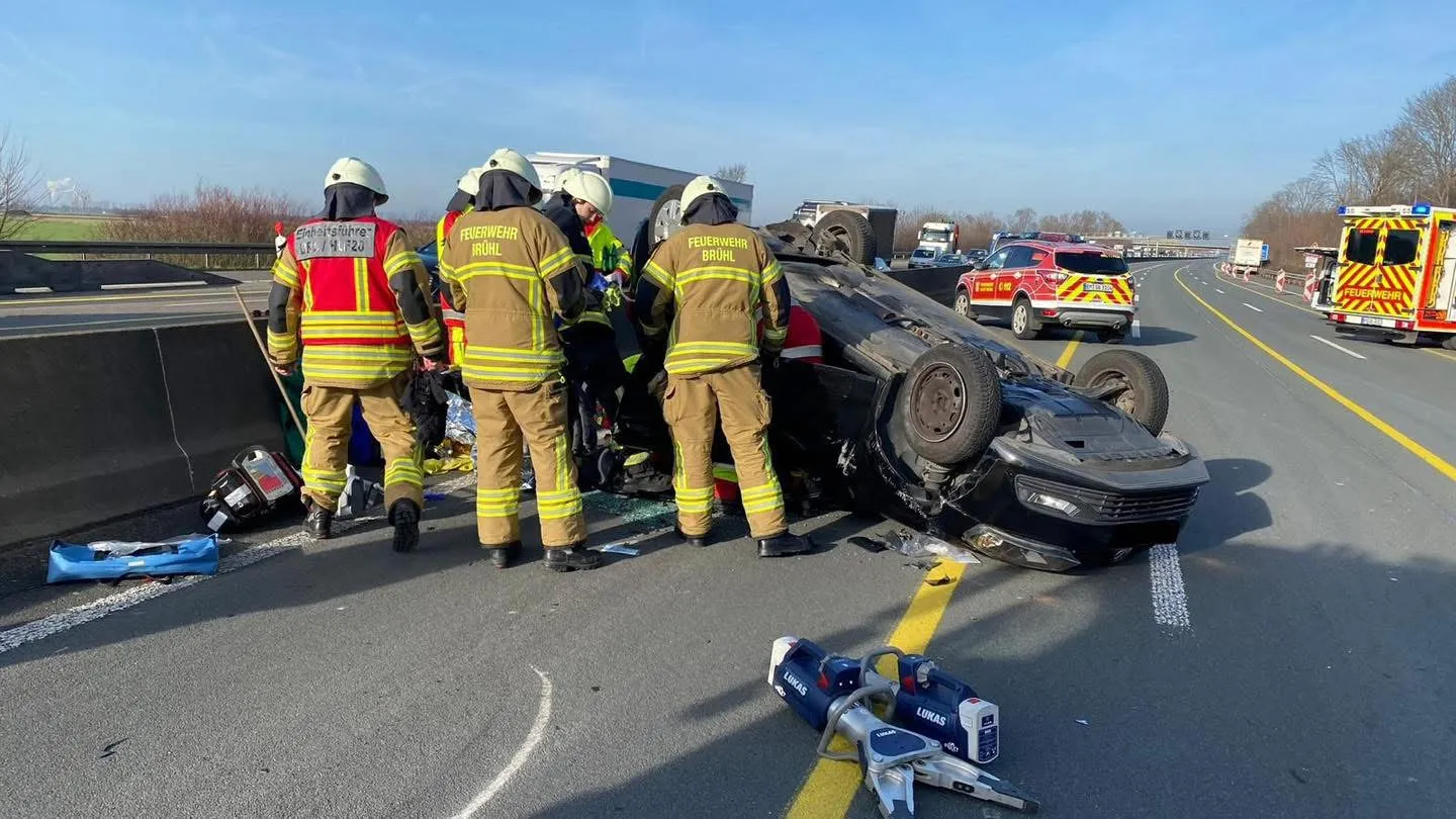 Nach Angaben der Feuerwehr Brühl ereignete sich der Unfall gegen 11:50 Uhr auf der A1 in Fahrtrichtung Köln. Ein Pkw kollidierte aus bislang nicht näher genannten Gründen mit einem Lkw. Infolge des Aufpralls überschlug sich der Pkw und kam auf dem Dach zum Stillstand.